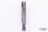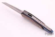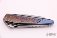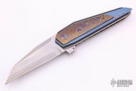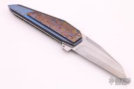 The Xplain Flipper, by Corrie Schoeman, features a wharncliffe Aichi San Mai Damascus blade with a false top edge, fileworked spine and under ricasso, ruby insets in the flipper. The handle has black timascus scales, the rear scale is also a tip down clip, orange peel finished titanium and black G-10 under the scales, fileworked and anodized titanium liners and backspacer with ruby inlay. Rides on bearings, nice detent, lockup and blade seating. Comes with velcro case and COA dated Dec 2019. Has a couple very light scratches, otherwise excellent condition. 1 of 1