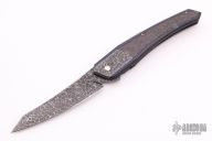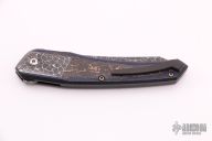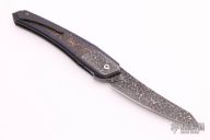 This Cobra by Cheburkov Knives features a Damascus blade with notched flipper. The handle has a black/blue/copper carbon fiber frame with inlaid Damascus bolsters, zirconium backspacer and tip up clip with hidden screws. Rides on bearings, nice detent, lockup and blade seating. Comes with original zippered case and COA. Excellent condition.