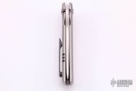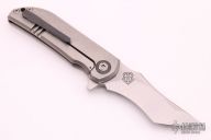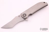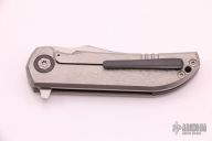 This UEDC by Nick Chuprin and John Gray features a two-tone recurve tanto blade with swedge and flipper. The handle is comprised of a bark finished titanium frame with zirconium pivot collars, hardware, zirconium backspacer and tip up clip with hidden screws. Rides on bearings, nice blade seating, detent and lock up. Comes with zippered case. Excellent condition.