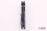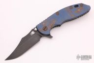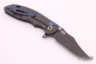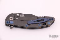 This XM-18 from Rick Hinderer features a battle black bowie blade, .165" thick blade. The handle has an anodized titanium scale, battle black titanium frame, bronzed titanium barrel spacers, anodized titanium hardware and pocket clip. Dual thumb studs and notched thumbrest. Reversible pocket clip. Strong lock up, nice detent and blade seating is center. Comes in the original packaging. Excellent condition. Has Tri-way pivot and extra hardware.