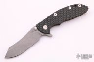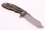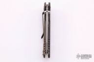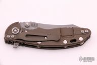 This XM-18 by Rick Hinderer features a working finished blade with notched thumbrest and flipper. The handle has a green/black G-10 front scale, battle bonze finished titanium frame, satin hardware, and a tip up or down reversible anodized titanium clip and filler tab, lanyard hole at the butt. Excellent condition. Comes with original box and extra pivot hardware.