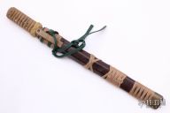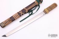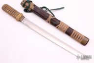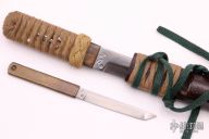 This Extra Long Aikuchi by Phill Hartsfield features a double ground tanto style blade with nice hamon, .249" blade stock and 1.078" blade depth. The handle has epoxied turks head knot and brown cord over a epoxied cord and scorpion menukis, hidden tang construction. Includes paper lined metal sheath with brown leather exterior that also holds the companion blade. Excellent condition. This knife also comes with a companion blade, chisel ground tanto blade, .123" blade stock and .507" blade depth, copper handle, hidden tang construction, 7.375" overall with a 3.75" blade. Excellent condition.