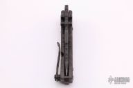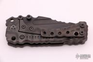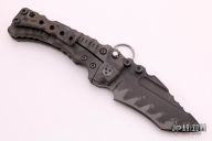 This Custom T-1 Folder by Miller Brothers Blades features a Z-Wear PM tanto recurve blade with textured spine, fullers, notched thumbrest and dual thumbstuds. The handle has a milled and sculpted titanium frame with flamed finish, matching tip up clip and a steel backspacer. Comes with a pin that can be inserted into the handle when open to lock the blade in the open position. Comes with original Pelican case and COA. New from maker.