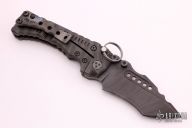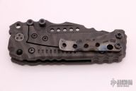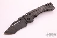 This Custom T-1 Folder by Miller Brothers Blades features a Z-Wear PM tanto recurve blade with textured spine, fullers, notched thumbrest and dual thumbstuds. The handle has a milled and sculpted titanium frame with flamed finish, matching tip up clip and a steel backspacer. Comes with a pin that can be inserted into the handle when open to lock the blade in the open position. Comes with original Pelican case and COA. New from maker.