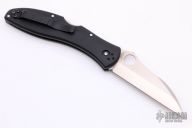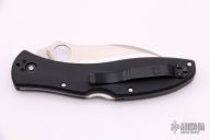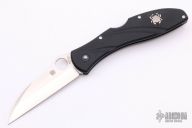 This knife features a satin finished wharncliffe blade with thumbhole and notched thumbrest. The handle has black plastic scales with Spyderco logo and black stainless steel tip up or down reversible clip.  Includes the original box.   Excellent Condition.