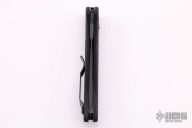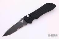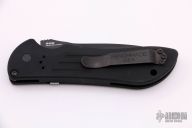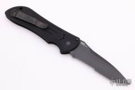 The Model 9100 Auto Stryker is the automatic version of Benchmade's Designer Series Stryker. Designed by Allen Elishewitz, the AutoStryker features a 3.5" 154CM drop point Tanto blade. The handle is made from 6061 T6 aircraft aluminum, hard anodized black for durability. This knife is designed for people who like the features of the Tanto blade shape, but do not want a chisel ground blade; the knife has a double bevel and is symmetrically ground. This one has a partially serrated black coated blade. Good strong action. Black tip up carry clip. Excellent condition. Comes with original box and papers.