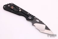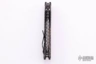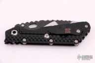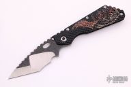 This XL framelock folder by Mick Strider features a Nightmare ground blade with dragon spine. The handle has a black gunner grip titanium frame and tip up titanium clip. Includes a "Lock Bar Stabilizer" for maximum reverse lock retention. Nice detent, lockup and blade seating. Comes with velcro case. New condition.
