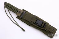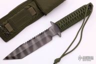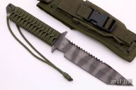 The BN-SS by Strider features a tiger stripe tanto blade with a serrated top edge .248" blade stock and 1.490" blade depth, full tang construction. The handle has a green paracord wrapped handle. Comes with a green nylon sheath. New condition.