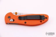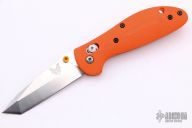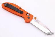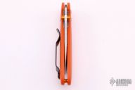 Mel Pardue design. Axis lock mechanism. Spear point blade with notched thumbrest and dual thumbstuds. Orange G10 handle with stainless liners and tip up clip. Excellent Condition.