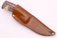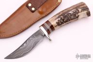 This custom hunter from Barry Dawson features a Damascus blade with false top edge, .203" blade stock and 1.047" blade depth, hidden tang construction. The handle has a nickel silver guard, stag grip and leather/black/white spacers. Includes a brown leather sheath and zippered case. Excellent condition. #001 on blade