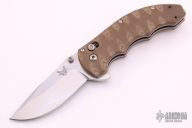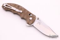 This Axis Lock flipper is a Ball Custom Knives Design executed by Benchmade. The tumble finished clip point blade has a swedge, dual thumb studs, notched thumbrest and flipper. The handle is comprised of sculpted tan and brown G10 scales over skeletonized steel liners and standoffs. AXIS locking mechanism. Includes the original box and papers. Has some light scratches on the clip, otherwise excellent condition.