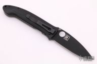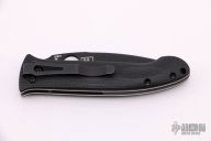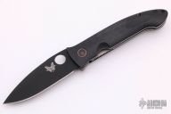 This Mini-Dejavoo by Benchmade features a black finished drop point blade with false top edge and thumbhole. The handle has black G-10 scales, stainless steel and titanium liners, and a black FRN backspacer, tip down black stainless steel clip. Excellent condition. Comes with original box and papers.
