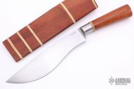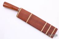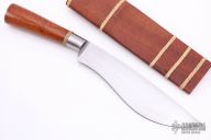 This knife by Ampan Ponyangnok features a hand rub satin finished blade with integral bolster, .225" blade stock and 2.138" blade depth, hidden tang construction. The handle has polished wood grip with stainless steel butt and ratan wrap behind the bolster. Comes with a stripped padauk wood scabbard with ratan wrap. Excellent condition. The Enep is a traditional Thai blade.