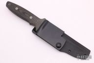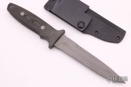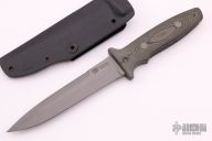 This fighter by Bob Terzuola features a bead blasted blade with a sharpened top edge and notched thumbrest, .202" blade stock and 1.127" blade depth, hidden tang construction. The handle has a black linen micarta grip with lanyard hole. Comes with a kydex sheath. Has a couple light scuffs, otherwise excellent condition.