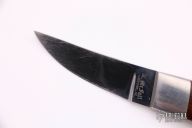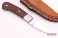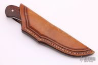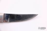 This Skinner by Ken McFall had a mirror polished blade, it has lots of scratches and needs to be resharpened. The handle has dovetailed stainless steel bolsters and snakewood scales with mosaic pins, full tapered tang construction with blade thickness of .130" and .876" depth. Comes with brown leather sheath. Has some scratches and needs to be resharpened, fair condition.