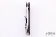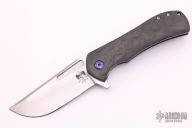 This Recon Flipper by Doc Shiffer features a satin finished blade with thumbhole, flipper and fileworked thumbrest. The handle has a marble carbon fiber scale and a satin finished titanium frame with scratch finished edges and laser engraved interiors, anodized titanium pivot and tip up clip. Rides on bearings, nice detent, lockup and blade seating. Comes with a COA dated 2-26-21. New from maker.