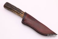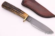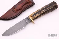 This Hunter by Doc Shiffer features a 3-alloy Damascus drop point blade with .141" blade stock and 1.063" blade depth, hidden tang construction. The handle has a brass guard and a stag grip. Comes with a brown leather sheath. Comes with COA. New from maker.