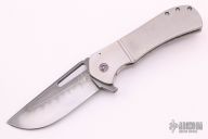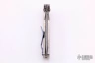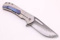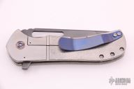 This Recon Flipper V3 by Doc Shiffer features a hand rub satin finished blade with nice hamon, thumbhole, flipper and fileworked thumbrest. The handle has a titanium frame with satin and orange peel finished and scratch finished edges and laser engraved interiors, anodized titanium pivot and tip up clip, copper pivot collars. Rides on bearings, nice detent, lockup and blade seating. Comes with a COA dated 2-26-21. New from maker.