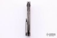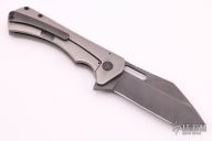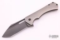 This Mastodon 3.5" by M Shiffer features a blackened blade with fuller, thumbhole and flipper, fileworked thumbrest. The handle is composed of an orange peel finished titanium frame, zirconium tip up clip and double black canvas micarta backspacer. Nice detent, lockup and blade seating. Comes with COA. New from maker.