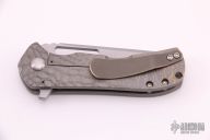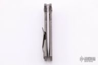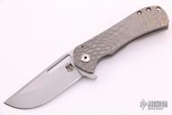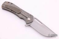 This Recon Flipper by Doc Shiffer features a bead blast finished blade with thumbhole, flipper and fileworked thumbrest. The handle has a laser engraved and tumble finished titanium frame with anodized and tumbled titanium tip up clip. Rides on bearings, nice detent, lockup and blade seating. Comes with a COA dated 2-28-21. New from maker.