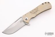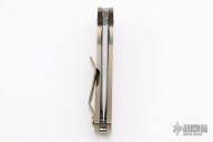 This Recon Flipper by Doc Shiffer features a bead blast finished blade with thumbhole, flipper and fileworked thumbrest. The handle has a laser engraved, anodized and satin finished titanium frame with matching tip up clip. Inside of frame is laser engraved with Japanese Wave theme. Rides on bearings, nice detent, lockup and blade seating. Comes with a COA dated 3-7-21. New from maker.