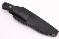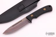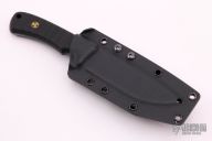 This K-1 fixed blade from TRC Knives has an apocalyptic finished drop point blade with fullers and notched thumb rest. 0.170" blade stock, 1.192" depth. Handle is comprised of sculpted black G-10 with lanyard hole over full tang construction. Includes black leather sheath with belt loop and kydex sheath with TekLok. Excellent condition.
