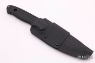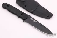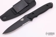 This Nimravus has a black blade with partially serrated edge and notched thumbrest, .120" blade stock and 1.300" blade depth, full tang construction with black G10 scales and lanyard hole. Kydex belt sheath. Allen Elishewitz design. Excellent condition. Comes with original box and papers.