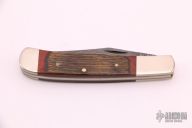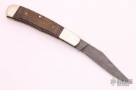This slip joint from Parker-Edwards features a rough finish Damascus clip point blade with nail nick. The handle is comprised of nickel silver caps and bolsters with wood covers over brass liners and steel spring. Excellent condition. Comes with original box.
