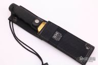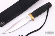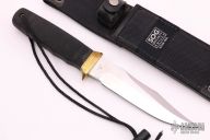 This bowie features a satin finished blade with a false top edge, .238" blade stock and 1.292" blade depth, hidden tang construction. The handle has a brass guard with rubber handle, brass lanyard tube at the butt. Comes with a nylon sheath. Has some light scratches, otherwise good condition.