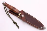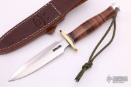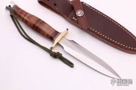 The Model 2-5 by Randall Made Knives is a heavily made dagger or dirk. This knife has a 5" carbon steel satin finished double-edged blade, .159" blade stock and 1.022" blade depth, hidden tang construction. The handle has a brass hilt and duralumin butt, stacked leather grip with red/white/blue spacers. Comes with a brown leather sheath. Excellent condition.