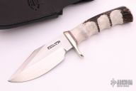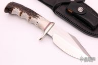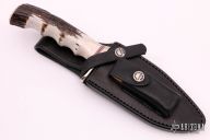 This knife has a satin finished stainless steel blade, with sharpened top edge, .231" blade stock and 1.781" depth, hidden tang construction. The handle has nickel silver guard and a stag handle with finger grips. Comes with black leather sheath. Excellent condition.