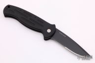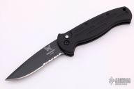 This Early AFO Automatic from Benchmade features a black drop point blade with swedge and partial serrations. The handle is comprised of black aluminum with a lanyard hole in pommel. Includes a nylon sheath and original box.