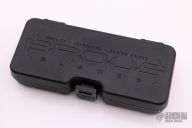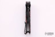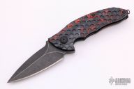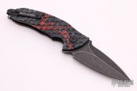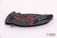 This custom Caliber from Brous Blades features an acid stonewashed blade with swedge and notched thumb rest. The flipper shows a serial number of #250 of 500. The handle is comprised of red/black kirinite with a hex pattern over black liners. Black steel tip up clip and lanyard hole. New from maker, excellent condition. Includes padded vault style case, pivot tool and COA dated 12/30/14