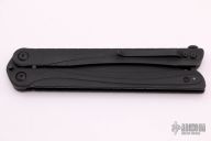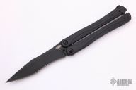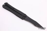 This Balisong from Brous Blades features a satin finished clip point recurve blade with notched thumbrest. The handle is comprised of a black finished stainless steel frame over barrel spacers, stainless steel tip up pocket clip. Numbered #78/500. Includes padded vault style case. Excellent condition.