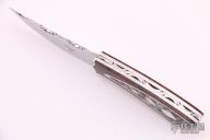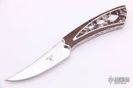 This fixed blade by Buck was customized by Painted Pony Designs. The knife features a mirror polished blade with a fileworked spine, .122" blade stock and .887" blade depth, full tang construction. The handle is made of obsidian, white/copper mica, mother of pearl, and is framed in textured aluminum, fileworked tang. Includes a wood and glass display case. Numbered 085/100. Comes with COA. Excellent condition.