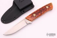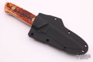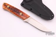 This K-7 Slim Outdoorsman by Dozier Knives features a satin finished blade, .137" blade stock and .865" blade depth, full tang construction. The handle has jigged bone scales with brass pins and lanyard hole. Comes with kydex sheath with belt clip. Excellent condition.
