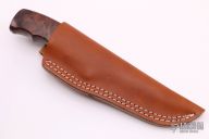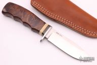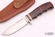 This Model 2 by Morseth Knives features a satin finished clip point blade, .197" blade stock and 1.126" blade depth, hidden tang construction. The handle has a stainless steel guard, desert ironwood grip with finger grooves, and black/brass/wood spacer pattern. Comes with a brown leather sheath and original paper wrapping. Excellent condition.