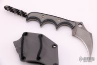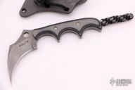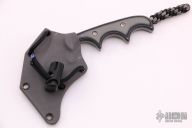 This Keraminimalist Neck Knife by Alan Folts has a tumble finished hawkbill blade with a notched thumbrest, .149" blade stock and 1.035" blade depth, full tang construction. Handle is black/grey G-10 scales with finger contours and lanyard. Excellent condition. Comes with kydex neck sheath.