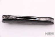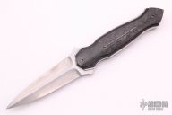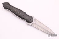 This Folding Dagger Linerlock Flipper by Corrie Schoeman has an Aichi stainless San Mai Damascus dagger ground blade with fileworked spine/flipper and flase top edge. Handle has marble carbon fiber scales over black G-10 and fileworked titanium liners, and fileworked titanium backspacer. Great blade seating, lockup and detent with zero blade play. Excellent condition. Comes with COA dated Dec 2019.