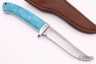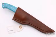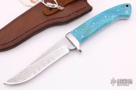 This knife by Jim C Provost features a Ladder Pattern Damasteel blade with .155" blade stock and .999" blade stock, full tang construction. The handle has a stainless steel guard with "Laguna Dragon" Juma scales. Comes with a brown leather sheath. Excellent condition.