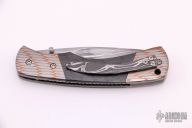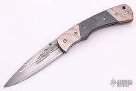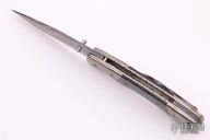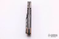 This Lightspeed by Steven Kelly features a Damascus blade with dual thumbstuds. The handle has dovetailed super conductor bolsters, marble carbon fiber scales, fileworked titanium liners, Damascus backspacer and tip up clip. Nice detent, lockup and blade seating. Excellent condition. Comes with a zippered case.