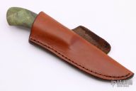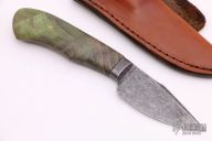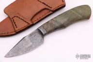 This Runt by Junior Smith Shawn Ellis features a dark drop point forge welded blade with integral guard and a hidden tang construction. .160" Blade Stock. 1.223" Blade Depth. The handle features a dyed stabilized wood grip. Includes a brown leather sheath. Includes makers card. New from Maker.