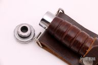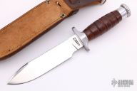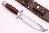 This Survival Knife by Garcia features a mirror finished spear point blade with sawteeth on the spine, .139" blade stock and 1.469" blade depth, hidden tang construction. The handle has an aluminum guard, stacked leather hollow handle and removable aluminum butt cap, has storage area in handle. Has a brown leather sheath. Has some scratches and a small ding in the guard, good condition otherwise.