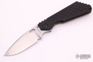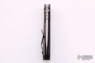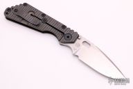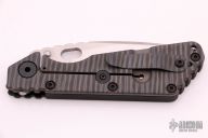 This Mick Strider SMF Fatty framelock folder features a stonewashed blade with thumbhole and notched thumbrest. The handle has a black aluminum and flamed titanium frame with titanium clip, tip up carry. Jimping on blade spine. Nice lockup, detent, and blade seating. Has a couple very light scuffs, otherwise excellent condition.
