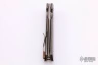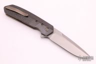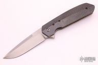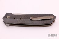 This 4F Flipper by Richard Rogers features a fine bead blasted drop point blade with swedge and flipper. The handle has zirconium bolsters with lightning strike carbon fiber scales over anodized titanium liners with matching tip up clip with hidden screws. Rides on bearings, nice detent, lockup and blade seating. Comes with a reissued COA. Excellent condition.