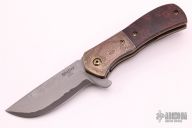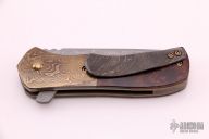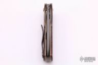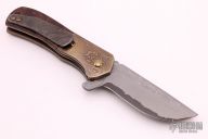 This Recon flipper features a Damascus blade with notched thumbrest. The handle has Damascus bolsters, ironwood burl scales, scratch finished and anodized titanium liners, Damascus backspacer and tip up clip. All the Damascus on this knife was made by the maker. Nice detent, blade seating and lockup. Rides on bearings. Comes with a zippered case. Excellent condition.