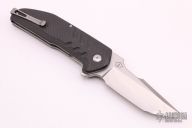 This Strife Linerlock Flipper (2/500) has a satin finished D2 tanto blade with swedge and notched thumbrest. Handle is carbon fiber over titanium liners. Black G10 and titanium backspacer, lanyard loop, and stainless steel tip up clip. Centered blade, flips great, and rock solid lockup. Excellent condition. Comes with Brous box and CoA.