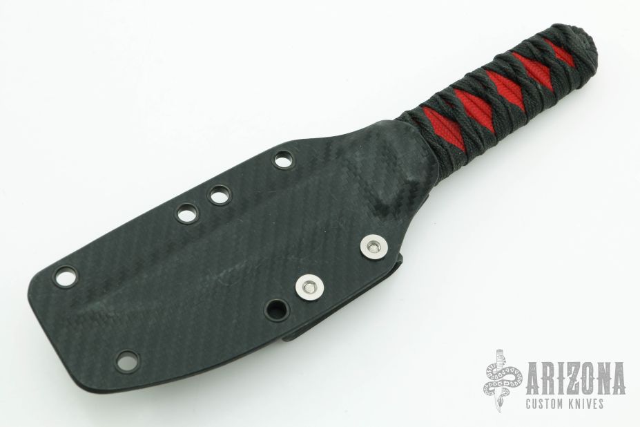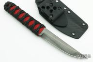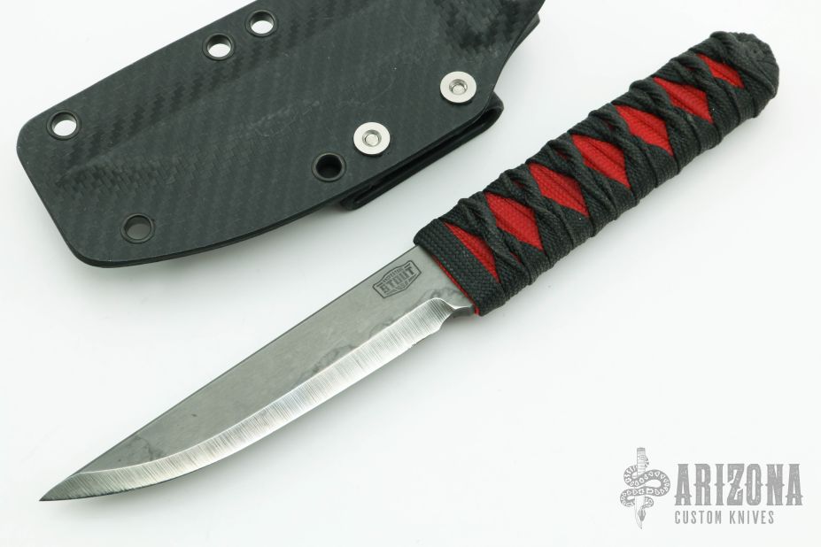 This Kwaiken by Jason Stout features a blade with nice hamon, has a flat ground scandi grind on one side and a hollow grind on the other, .189" blade stock and .853" blade depth, hidden tang construction. The handle has black cord wrap over red cord wrap. Comes with a kydex sheath. Excellent condition.