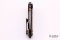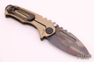 This Micro Praetorian from Medford Knife and Tool features a Vulcan finished drop point blade with notched thumbrest and ambidextrous finger groove. The frame is comprised of an anodized titanium frame with matching tip up pocket clip. Stainless steel backspacer doubles as a glass breaker. Comes with hard case and original box.  Excellent Condition.