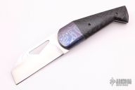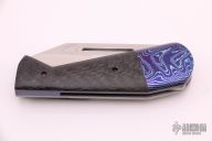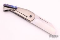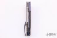 This Hawkeye framelock folder by Jay Gale features a satin finished blade with thumbhole. The handle has a mokuti bolster, carbon fiber scale. anodized titanium liner and a satin finished titanium frame, tip up mokuti clip. Nice detent, lockup and blade seating. Excellent condition.